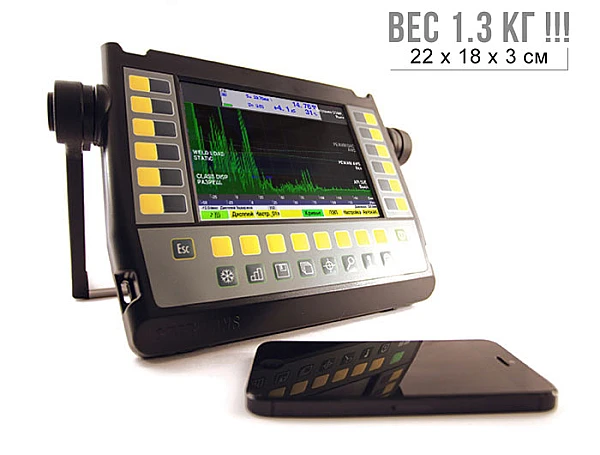 Габариты прибора 188 х 224 мм, а масса составляет 1.3 кг. Это дает возможность производить исследования в самых труднодоступных местах, в то же время оставаясь достаточно удобным для дефектоскописта. Этот прибор оснащен цветным высококонтрастным TFT - дисплеем, с разрешающей способностью 1024 х 768 пикселей и с размером 99 : 133 мм, который позволяет работать при достаточно низких температурах: от -20°C.