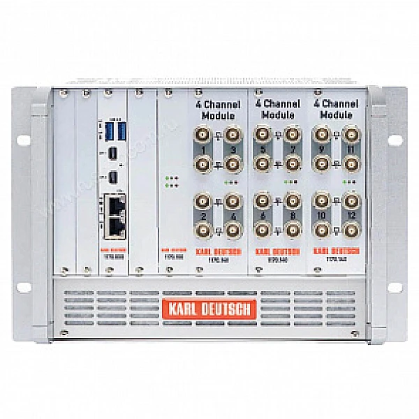 Каждый модуль УЗК имеет 4 мультиплексных, независимо настраиваемых канала для раздельно-совмещенных или совмещенных преобразователей. Максимальную частоту следования импульсов 8 кГц можно произвольно распределить по четырем каналам, тем самым средняя максимальная частота следования импульсов будет равна 2 кГц. Один из четырех каналов каждого модуля может одновременно делать замеры, поэтому, если используется несколько модулей, возможна параллельная работа мультиплексных каналов. На главный модуль поступают данные с каждого отдельного канала, он их конфигурирует и контролирует программу цикла.