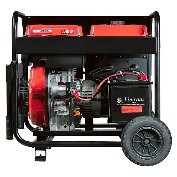 Запуск двигателя осуществляется с помощью электростартера, что делает процесс запуска быстрым и простым. Наличие предпусковой системы подогрева воздуха и свечей накаливания гарантирует легкий запуск даже при отрицательных температурах. Прочная рамная конструкция и транспортировочные колеса значительно упрощают перемещение оборудования. Ручки для переноски делают его удобным в обращении. Многофункциональный дисплей отображает все необходимые параметры: напряжение, частота, моточасы, мощность и ток, что позволяет постоянно контролировать работу электростанции.