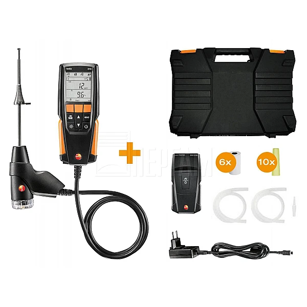 Анализатор дымовых газов testo 310 в комплекте с ИК-принтером (0554 3100), зондом отбора пробы длиной 180 мм с фикс. конусом, силиконовым шлангом для измерения давления, 2 рулонами термобумаги для принтера, пылевыми фильтрами (5 шт.) и заглушками (5 шт.)
