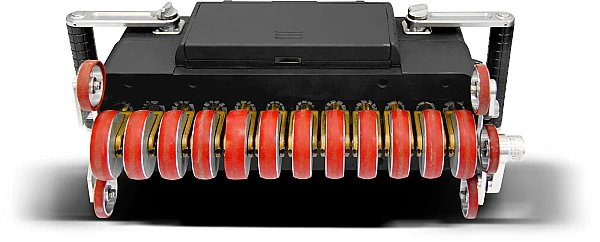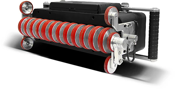 • Одна из пар опорных колёс закреплена на корпусе моноблока неподвижно. Другая пара установлена на оси, и может, как маятник поворачиваться вокруг неё в небольших пределах, заданных ограничителями. Такое решение обеспечивает устойчивую установку моноблока всеми четырьмя колёсами на поверхность ОК не только цилиндрической формы вдоль образующей, но и под острым углом к ней, а также на поверхности конической, сферической и более сложной формы, но с локальным радиусом кривизны не менее 1400 мм.