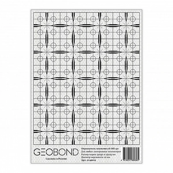 Отражатели Geobond ОП-50 имеют оригинальную форму, которая позволяет автономно использовать марку либо целиком (50 х 50 мм), либо 1/4 ее часть (25 х 25 мм). Это создает дополнительные удобства, т. к., приобретая всего один тип пленочного отражателя, пользователь имеет возможность, оптимально подбирать необходимый размер марки в зависимости от расстояний, на которых планируются измерения. К достоинствам разметки относятся бисекторные и контрбисекторные штрихи различной толщины, значительно упрощающие наведение на них, а также повышающие точность взятия углового отсчета при работе на больших расстояниях. Разметка пленочного отражателя нанесена специальной водостойкой краской, выдерживающей воздействия спирта и бензина, а сама пленка имеет гарантированный срок службы при уличной эксплуатации 10 лет.