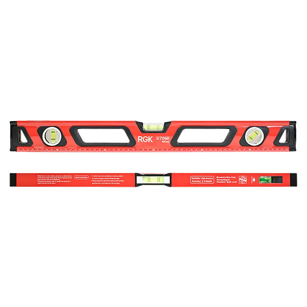 На узком верхнем ребре строительного уровня RGK U7060 находится окошко, в котором с помощью системы зеркал отображается положение пузырька вертикального уровня. Благодаря этому, удобно контролировать вертикальные поверхности в узких нишах и в прочих труднодоступных местах.