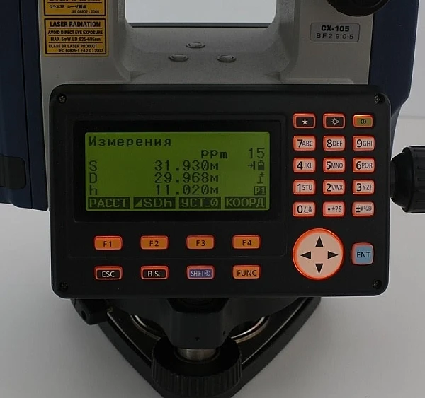 Среди нововведений в первую очередь хотелось бы отметить увеличенную дальность безотражательных измерений. Теперь при помощи тахеометра Sokkia CX-105 можно работать без помощи отражателя на расстоянии от 30 сантиметров до 500 метров, с линейной точностью 3 миллиметра. При использовании отражателя дальность измерений может достигать 400 метров, при этом точность определения расстояний составляет 2 миллиметра +2 мм на каждый километр рабочего расстояний. Вынесенная на боковую панель инструмента кнопка запуска измерений позволяет работать еще быстрее, и не отрывать взгляд от окуляра зрительной трубы.