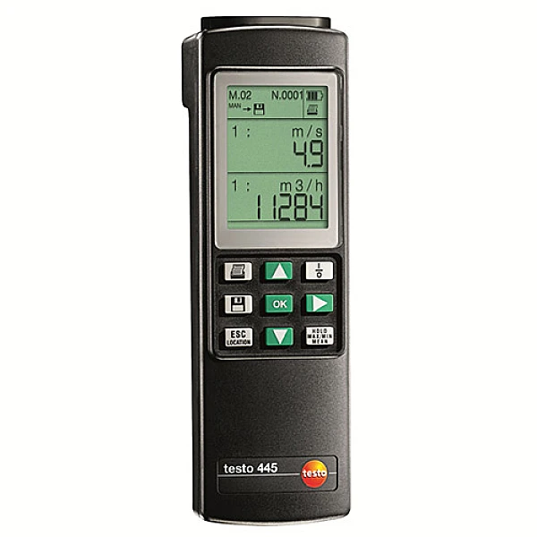 Testo 445 – это многофункциональный измерительный прибор, основное назначение которого - наладка систем отопления, вентиляции и кондиционирования. Благодаря широкому перечню первичных датчиков (зондов) для измерения Testo 445 занимает достойное место в своем классе. Прибор способен определять такие параметры, как температура, влажность, скорость газовых потоков, дифференциальное и абсолютное давление, а также концентрация в воздухе СО и СО2.