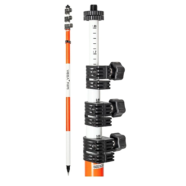 Телескопическая веха VEGA P46FG предназначена для установки отражателей и ГНСС приёмников в условиях сильнопересеченной местности или значительных по высоте препятствий, ограничивающих видимость. Веха имеет вес всего 2 кг и изготовлена из не проводящего ток фибергласса. Для установки в вертикальное положение веха снабжена уровнем. Закрепительный механизм в виде зажимного винта надёжно фиксирует секции вехи.